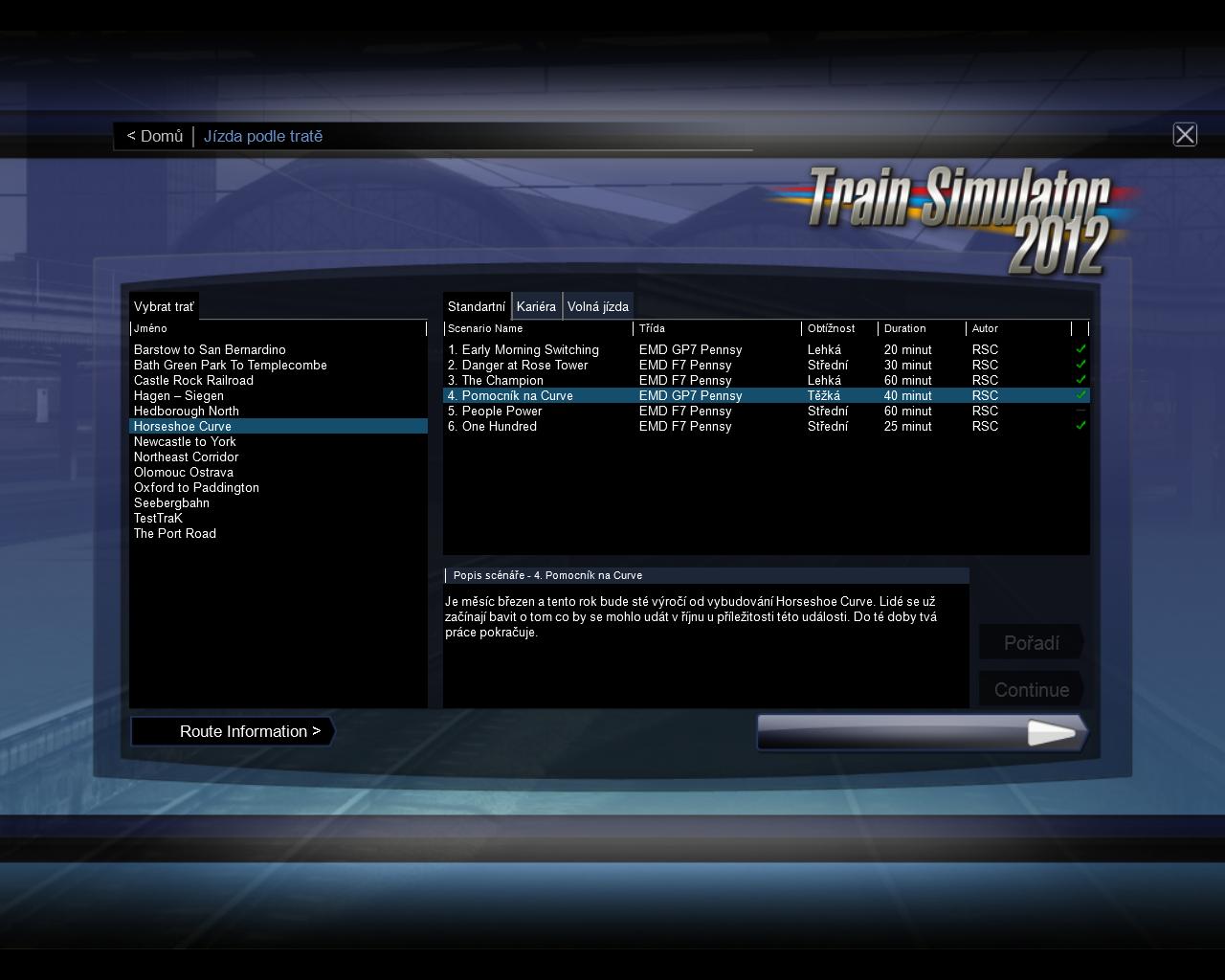 Již nějaký ten den pracuji na překladu pro RailWorks 3: Train Simulator 2012. Né že by to byla nějaká extra novinka, ostatně s překladem RailWorks 2 jste se už mohli setkat. O jeho kvalitách raději pomlčím (použít překladač není v takovém případě dobrá volba). Překlad na kterém pracuji neobsahuje pouze přeložené jádro hry, ale obsahuje i přeložené scénáře ve hře a to včetně launch aplikace (obrázky a texty v ní). V současné době je jádro hry včetně základních scénářů (tzn všechny základní tratě co jsou součástí hry) přeloženo. Najde se pár míst, kde ještě nejsou doplněny texty, ale to už je takový malý zlomek. Dokonce je přeložena z části i nová trať Horseshoe Curve.