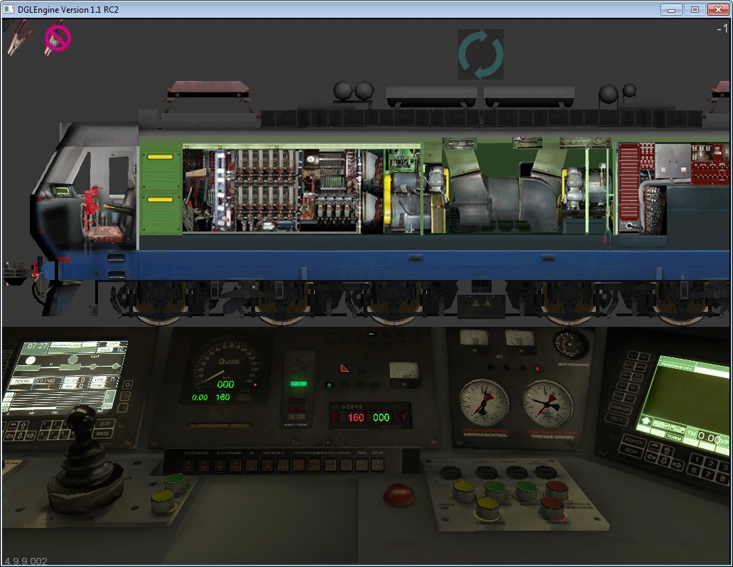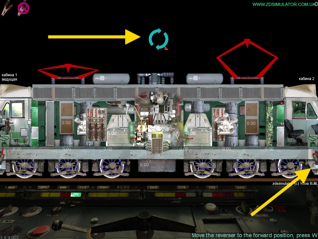 Od 4.9.9 umí ZDSIM jednak přepínat kabiny, což se děje pomocí šipky na schématu. Dále je možné lokomotivu odpojit od soupravy díky páky na schématu (viz dolní šipka). Napojení u ukrajinských a ruských poloautomatických spřáhel SA-3 se provede najetím na soupravu.