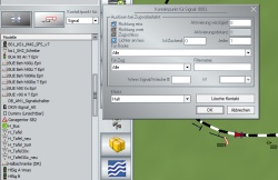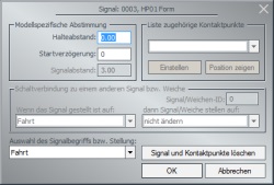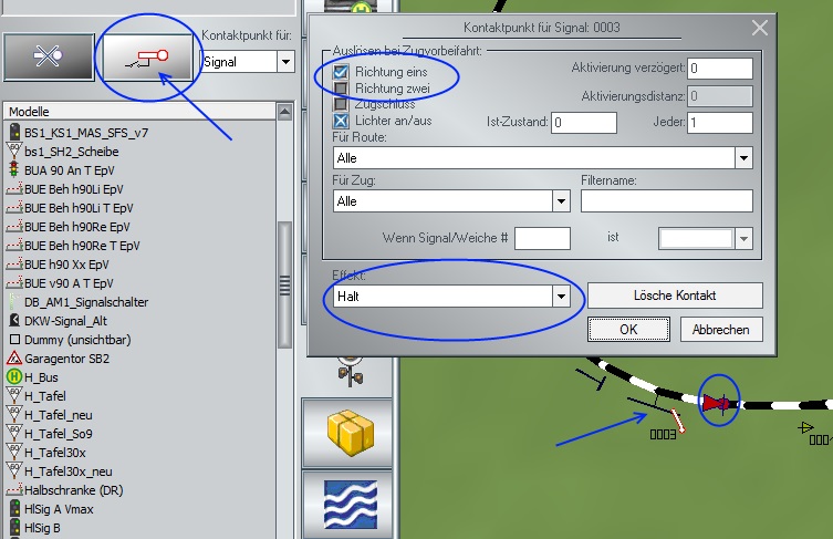 Klikneme na návěstidlo a v nabídce vlevo vybereme kontakt pro signál. Ten umístíme ZA vybrané návěstidlo ale PŘED následující výhybku. Pravým tlačítkem otevřeme jeho vlastnosti a nastavíme, že platí jen pro "náš" směr "Richtung" - záleží na směru pokladky kolejí - směrodatný je směr šipky po opuštění vlastností. Ještě nastavíme dole "Effekt" na "Halt". Tato sestava nám zajistí, že jak vlak mine návěstidlo, toto se samo shodí na "STUJ". Udělejme pro všechny tři návěstidla.