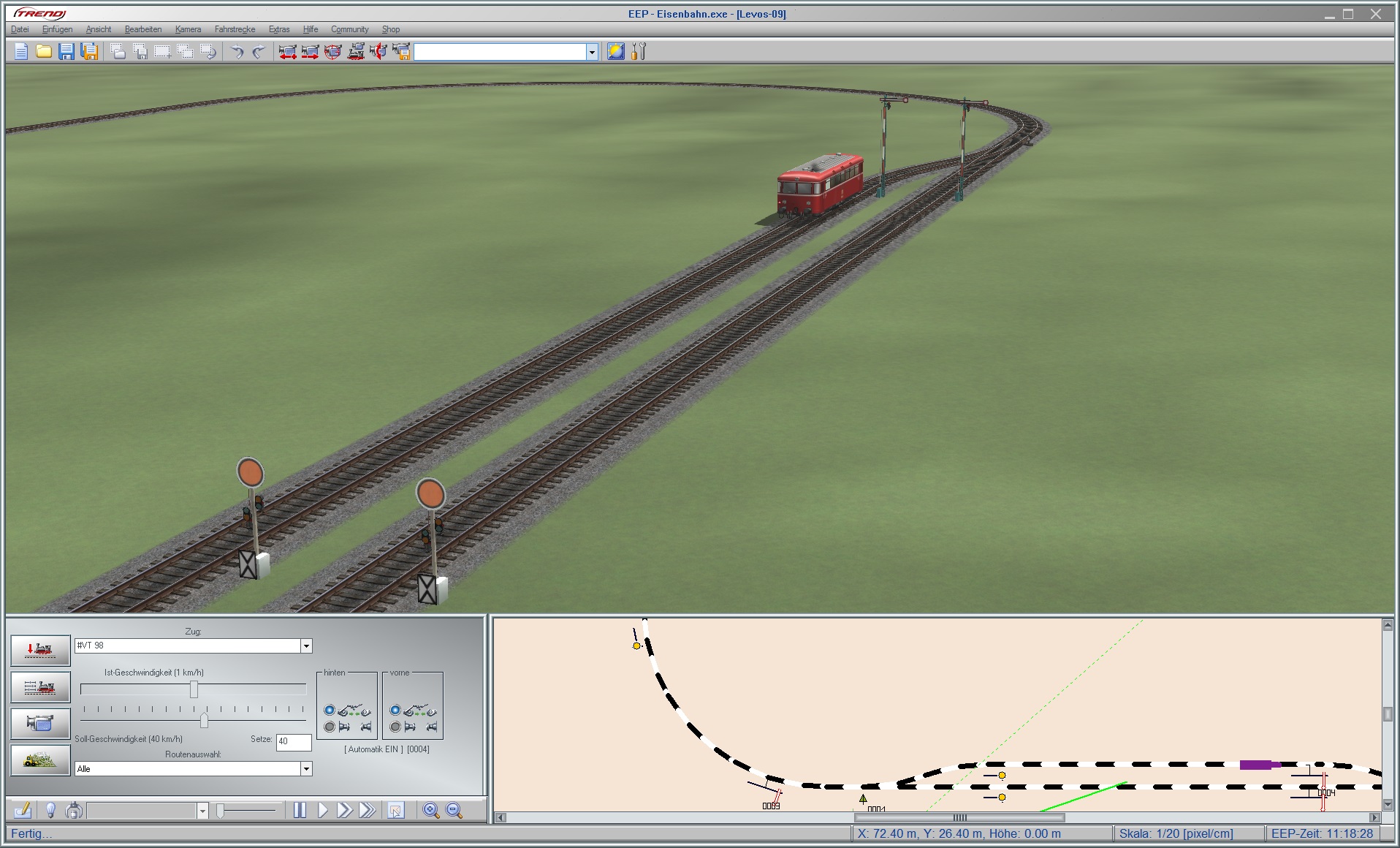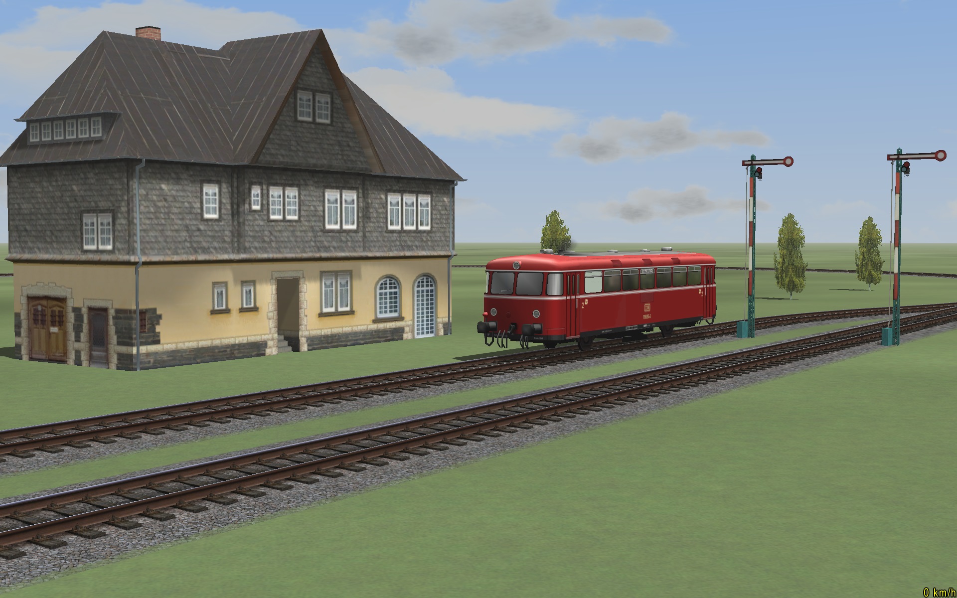 Nasaďme v 3D okně vlak. Doporučuji vybrat pro naší venkovskou stanici motoráček v sekci "Rollmaterial, Bahn, Normalspur, Triebwagen, Triebwagen" typu "VT58". Pozor, nezaměnit za "VS58" či "VB58", to jsou přípojné vozy. Přepněme do automatického režimu, rychlost 40 km/h. Může se stát, že po nasazení se vlak rozjede přes STUJ, to je dáno místem vyhodnocování návěsti. Po okruhu už pojede správně.