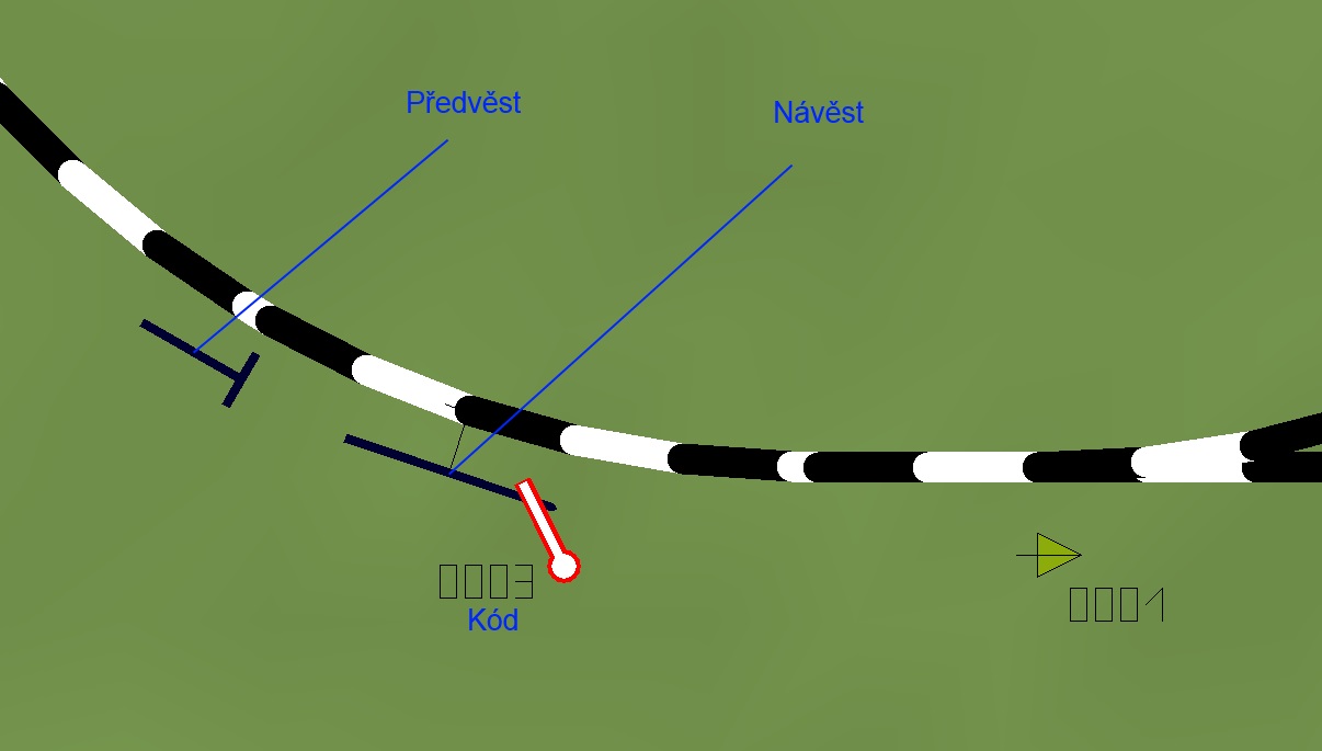 Jak vidíme, umístila se nám jednak předvěst a druhak návěstidlo. Kliknutí na návěstidlo se obě vyberou a můžeme předvěst umístit o něco dál. Kliknutím pravým tlačítkem si můžeme otevřít vlastnosti návěstidla.