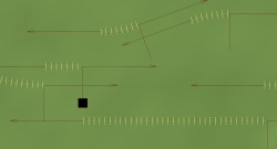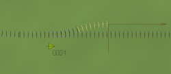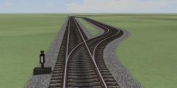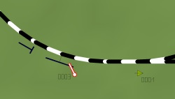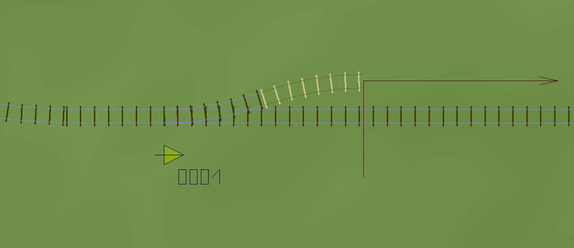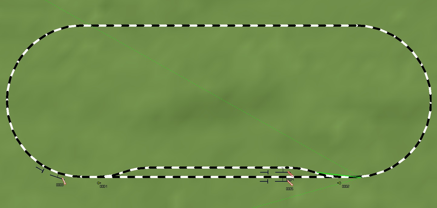 Nyní vezmeme výhybku a koncem s "šipkou" ji nasuneme na konec oblouhu tratě. Na její konec pak podobně umístíme nyní 50m původní kolej. Všimněte si, že výhybka, ač je z obou stran "umístěná", barvu nezměnila. Nejsou totiž ukotveny všechny její body. A to uděláme teď, vezmeme oblouk s kladnými hodnotami a umístíme ho na místo na kolej v místě přestavníku (černý čtverec), pokud je vše v pořádku, objeví se světle zelený trojúhelník a kód vytvořené výhybky, zde 0001. Poslední oblouk (se zápornými hodnotami) umístíme na konec oblouku, aby konec šel paralelně se stávající rovnou kolejí. Výsledek by měl vypadat takto: