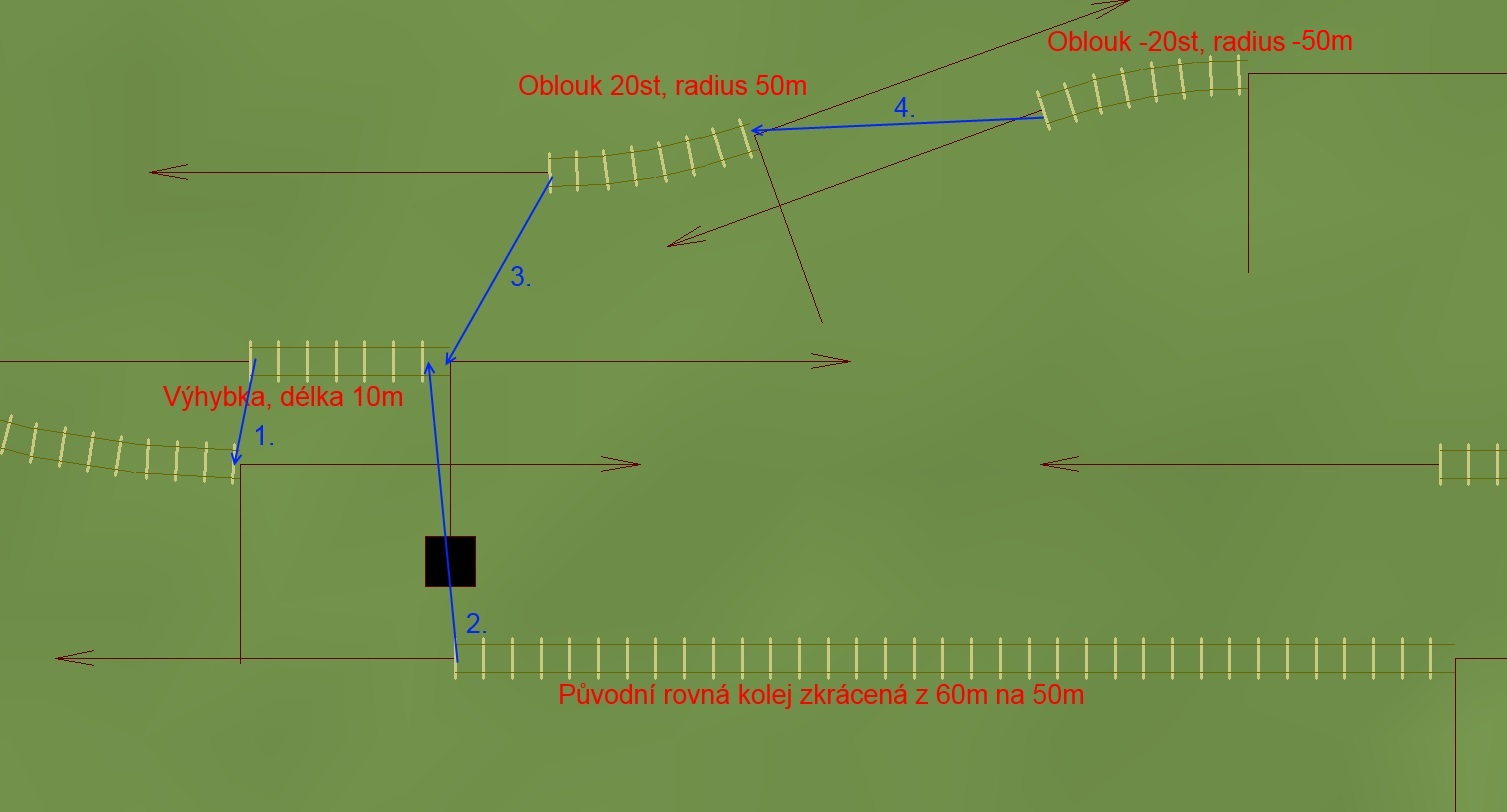 Dole si tedy uděláme stanici "Jižní město". Nejprve "chňapneme" první rovný díl (ten vlevo) a posuneme si jej o kousek dolů, otevřeme vlastnosti (pravé tlačítko) a zkrátíme "Lange" z původních 60m na 50m. Pak v sekci kolejí vybereme kolej pro výhybku (tj tu vlevo dole) a plácneme ji nad volné místo. Otevřeme její vlastnosti a nastavíme délku 10m. Vložime si do volného prostoru dvě rovné koleje, jednu upravíme na oblouk 20 stupňů a poloměr 50m, duhou totéž, ale oboje záporně. Měli bychom tedy mít toto: