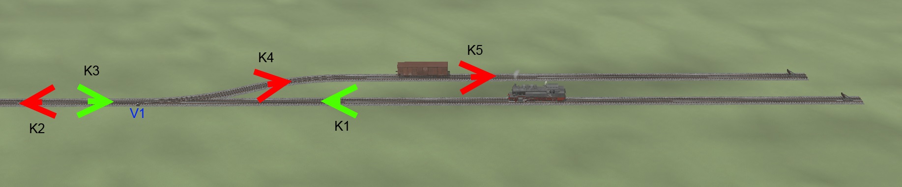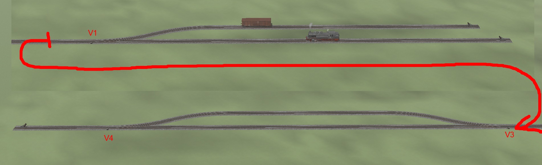 A teď jedeme z kopce. Dnes jsem si připravil kolejiště viz obrázek. Tu trať "mezi" (onen červený spoj) mám rovně, ale to není podstatné. Naším úkolem bude rozjet lokomotivu, připojit vagón na odbočce, dojet do druhé stanice, na boční koleji vagón odpojit a s lokomotivou zůstat stát na "průjezdné" koleji. A to vše automaticky.