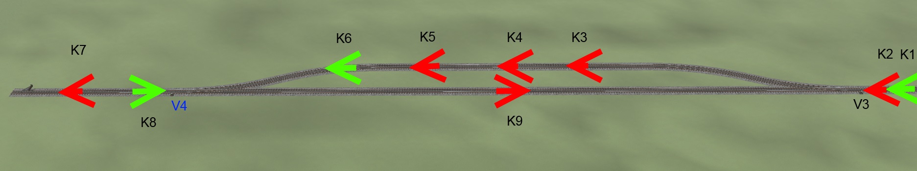 Vidíme dvě paralelní koleje, obsluhované výhybkami V3 a V4.