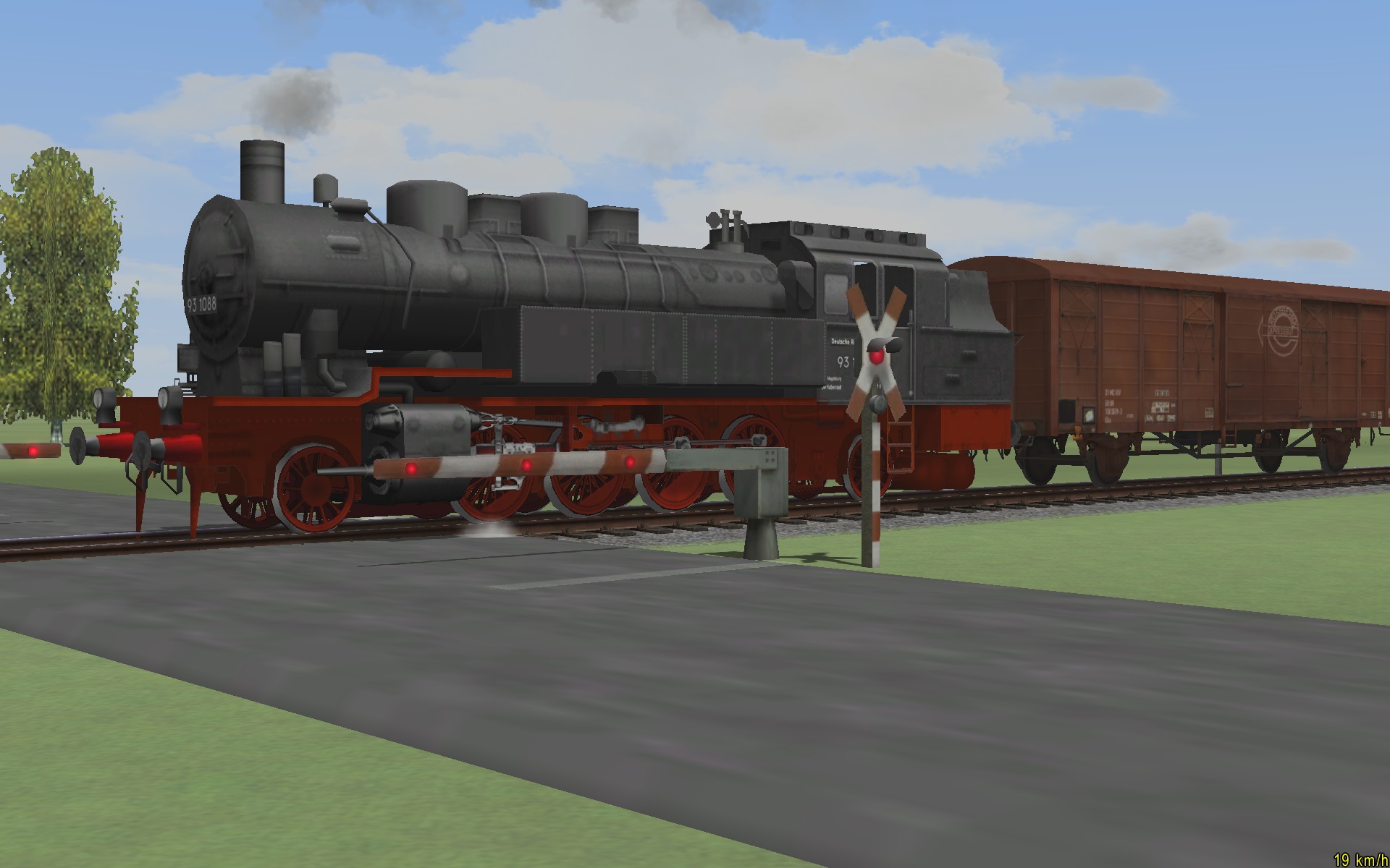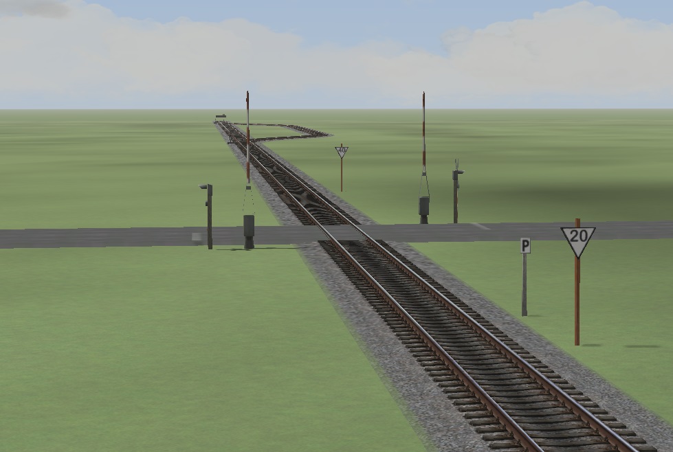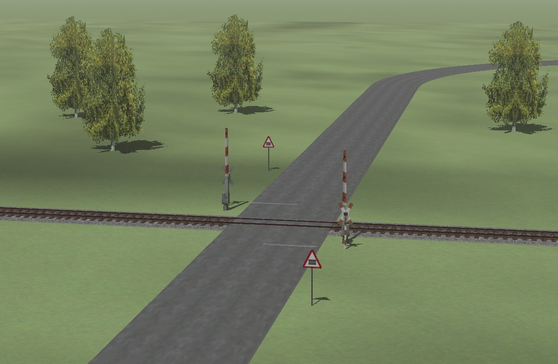 Pro ještě větší efekt si můžete dát před přejezd na koleje kontakt typu Fahrzeug (vozidlo), do správného směru (Richtung), pro veškerý provoz (Alle), a nastavte zahoukání "Warnsignal geben" a zpomalení (Geschwindigkeitsuberwachung festlegen 20kmh). Za přejezd pak další kontakt typu Fahrzeug (vozidlo), do správného směru (Richtung), pro veškerý provoz (Alle) a vrácení rychlosti na traťovou rychlost, řekněme 40kmh (Geschwindigkeitsuberwachung festlegen 40kmh). K dokonalosti nám chybí návěsti a to prosím tedy napravme umístěním Immobilien / Verkehr / Signaltafeln návěstí "Lf4 20 Holz" resp "Lf4 40 Holz" (rychlosti) a "Pfeiftafel" (Pískejte).