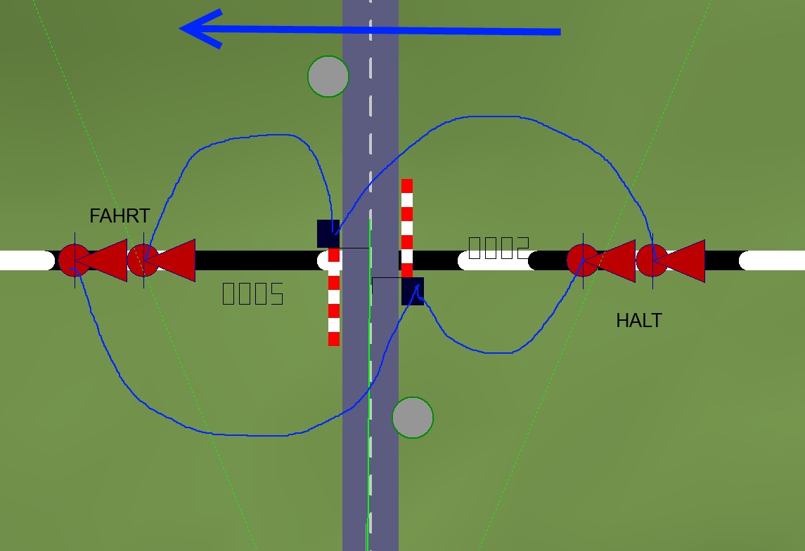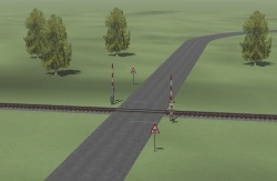 V sekci Signalle vyberme Halbschranke(DR) /můžete zkusit i BUA Beh objekty/ a umístíme na silnici (opakuji - na silnici) poblíž přejezdu, z každé strany kolejí jednu závoru (jeden objekt). Ve 2D pohledu je ta závora indikována jako zvednutá, tak aby vás to nepopletlo, že "zavíráte trať". Připomínám, že otočení objektu na druhou stranu silnice dosáhneme přetažením "předvěsti" za návěstidlo - tím se to otočí. Ano, i silniční závora má /neviditelnou/ předvěst, důvodem je nejspíš reálnější chování aut, aby z 90 kmh nezastavovaly na metru.