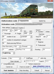 Nejprve tedy jak nastavit svou "misi". Vybereme lokomotivu 2TE10U, zvolíme nákladní (Freight) vlak, zadáme 50 vagónů, což nám automaticky navrhne typ vagónů "gondola01" a dopočte 200 os (axes). Hmotnost "tons" stanovme na 50 (vagónů) krát 23t (prázdný EAS) + 50t (ložná hmotnost), dohromady 50 * 73t = 3650t. Vozy s klimatizací "compartment carriages" dáme 0. Trať "Kiev-Shevcenko 7.02", směr "Forward", pozice "ordinate" na "KievPass". Předsazení lokomotivy "Shunting" 18.