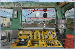 Pomocí U vypneme řízení v této kabině, pravým tlačítkem myši zobrazíme lokomotivu, otevřeme ventil průběžného potrubí na pravém konci lokomotivy (kontrola svěšení lokomotivy a prvního vozu patří k povinnostem strojvedoucího) a kliknutím na kruhové šipky změníme kabinu na tu přední.
