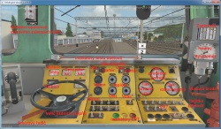 Po načtení simulátoru se nacházíme na lokomotivě v kabině směřující k vagónům.
